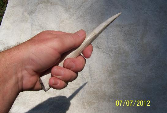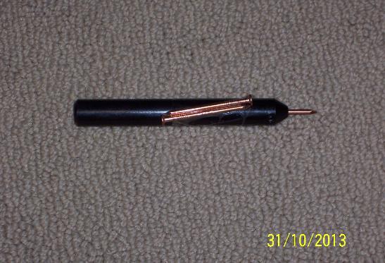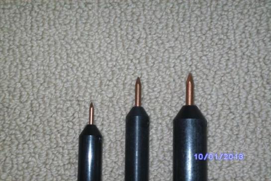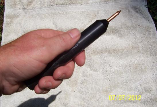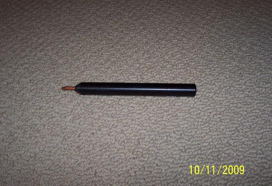 | My standard pressure flakers are constructed from a 6 inch section of 7/8 " diameter black Delrin. The Pressure Flaker Lite is 6" long and like it's companion the Ishi Lite, is constructed of 5/8" Delrin. The Detail Pressure Flaker is 5" long and is also constructed of 5/8" Delrin. They are machined on a lathe to accept the most popular sizes of copper nails. They each include a nail (Detail Flaker includes 2 extra nails), and the nail is held in place by two setscrews. Refill nails are available. |