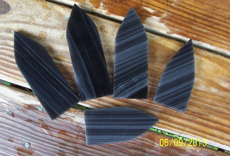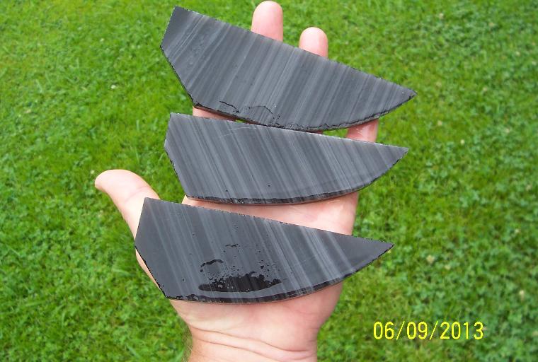 | My Banded Obsidian blanks are cut from the best Davis Creek banded obsidian and exhibit a gorgeous array of banding. They are available in lengths from 2 inches in length to 8 inches. They are 3/8" in thickness, just right for pressure flaking. Longer lengths are 2 inches wide and shorter lengths are 1 3/4" wide. Banded Obsidian blanks are $2 per running inch and always in stock for immediate shipment. |