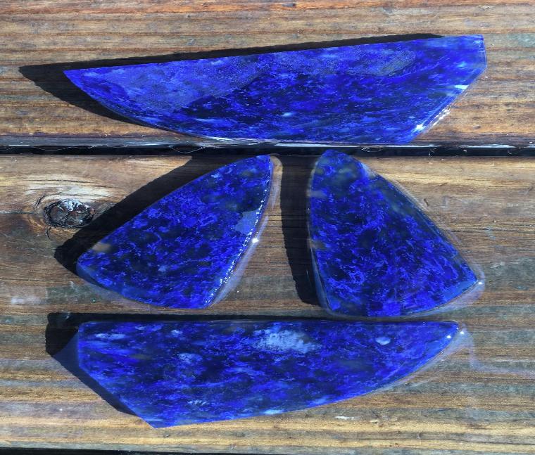 | This material is not glass. It's a man made quartz but flakes very easily similar to glass and obsidian. It has beautiful blueberry colored swirls all throughout with intermingled translucent areas. Points and knives made of this material are quite striking. |