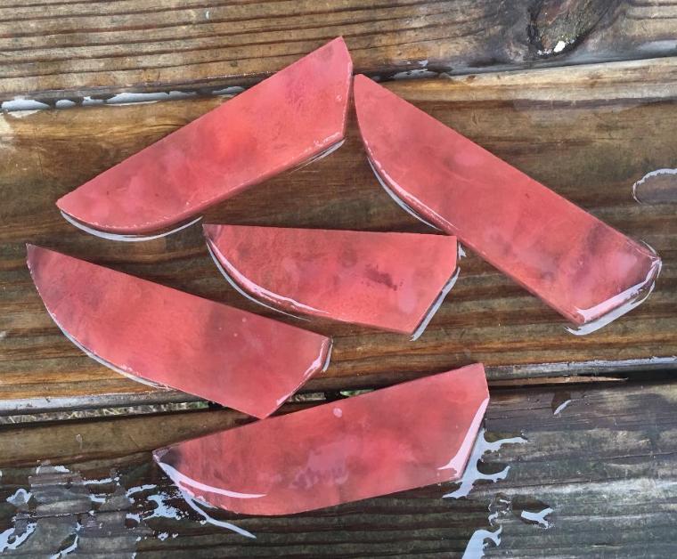 | This material is not glass. It's a man made quartz but flakes very easily similar to glass and obsidian. It has beautiful cherry colored swirls all throughout with intermingled translucent areas. Points knives made of this material are quite striking. |