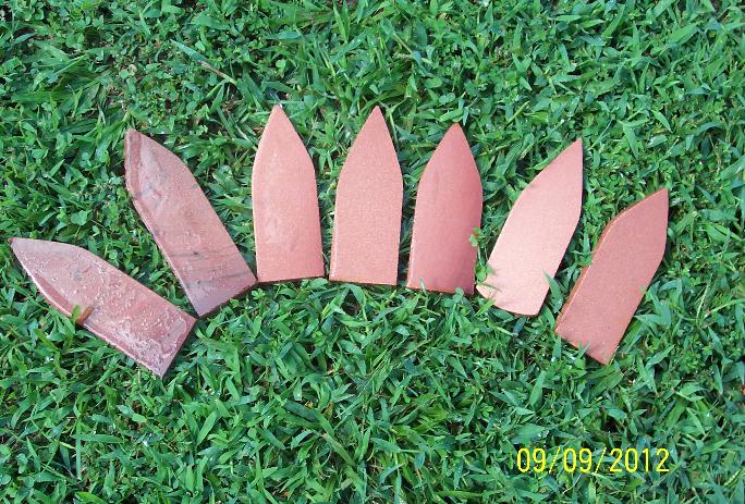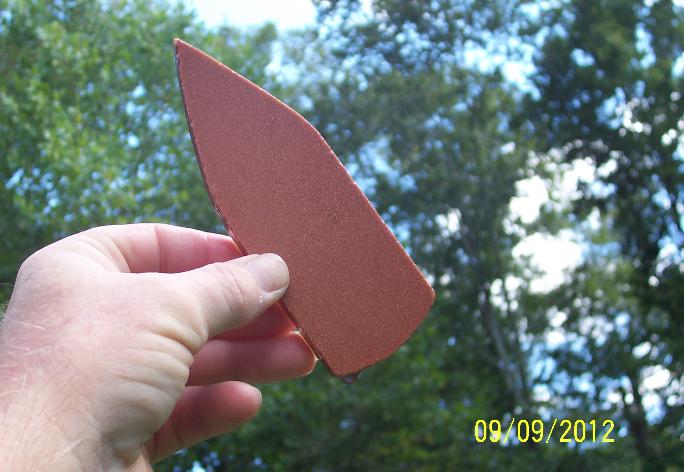 | Goldstone in a man made material that is totally filled tiny gold colored flecks. Knappers love it, as do their customers who admire the beauty of points crafted from it. I offer it in preshaped pressure flaking slabs from 2" through 6" in length. The slabs are my usual nearly 3/8" in thickness and priced at $2 per running inch. |