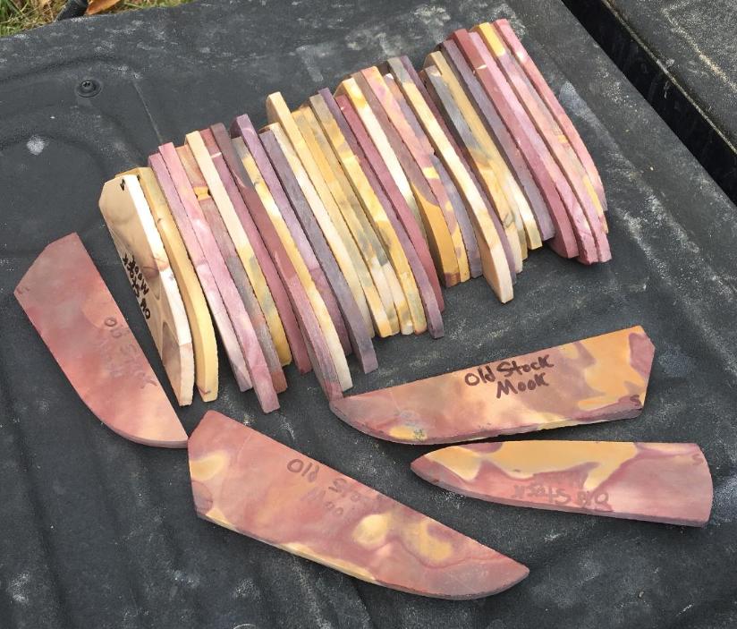 | I've obtained a large amount of old stock Mookaite and am processing it every day. It is available in size and quality never seen before. I'm again able to offer blanks in longer lengths at all times. NOW AVAILABLE IN KNIFE TRIM. |