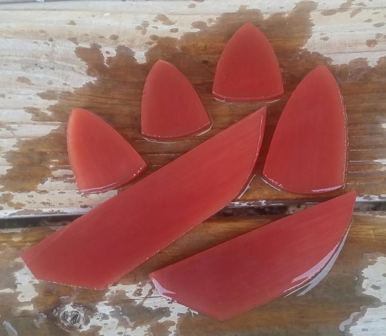 | I now offer 7 different colors of fiber optic glass in preshaped blanks. They are all offered in regular trim in lengths from 2" through 7". The knife blade trim will be offered in 4", 5", 6". and 7". This material makes beautiful eyecatching points. The red is one of the more popular colors. |