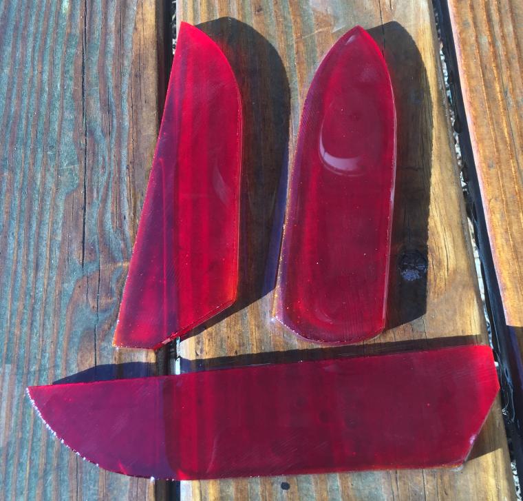 | What do you do when you try for years to find quality dark red translucent glass with absolutely no luck? You contract with a glass company to custom make it to your specs. I just accepted shipment on 100 blocks of number one quality red glass in 12x8x2 size. I'm cutting and trimming it daily and have hundreds of inches in stock for immediate shipment in both traditional and knife blade trim. Stay tuned as in the near future, Dark Green, Orange, Yellow, Turquoise, and other eyecatching colors will be available. |