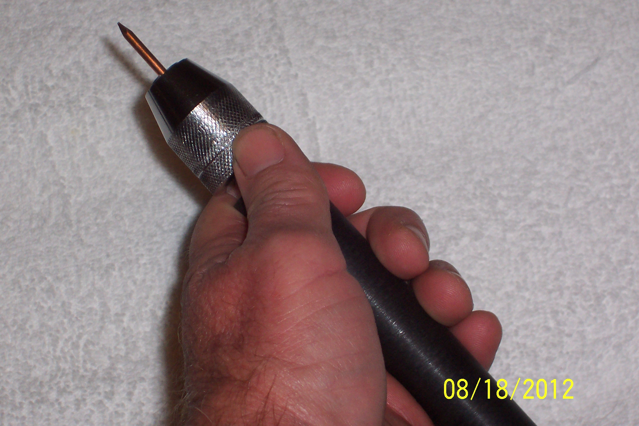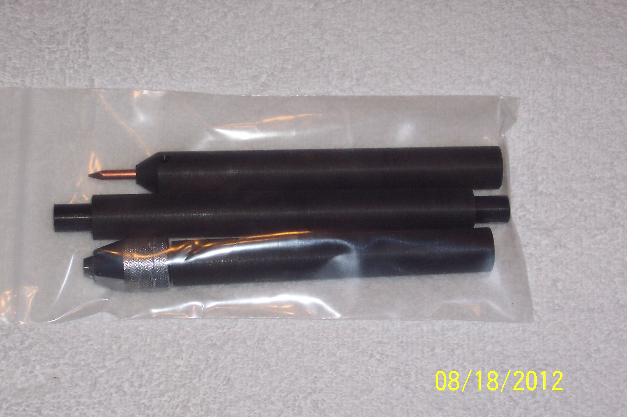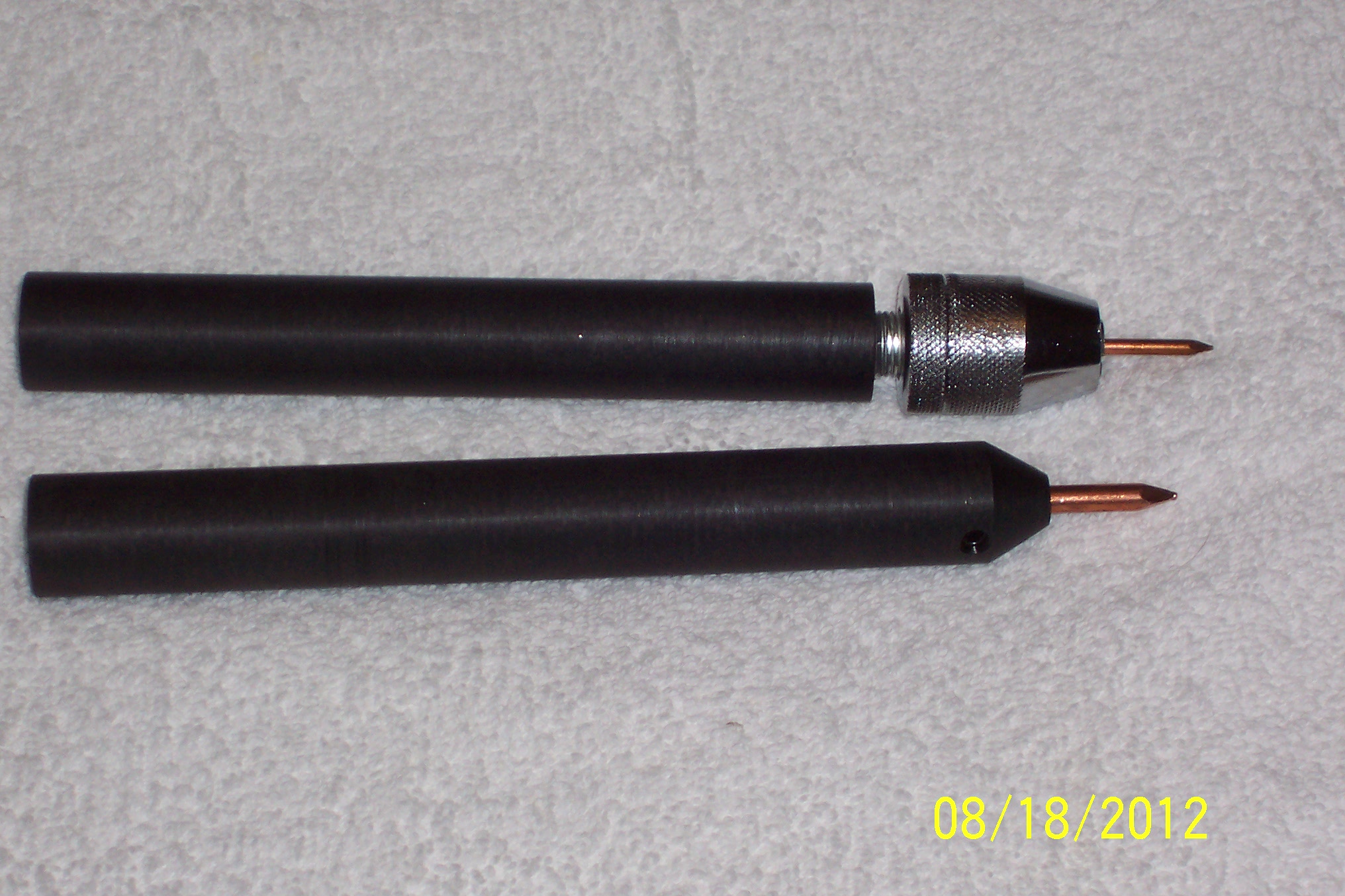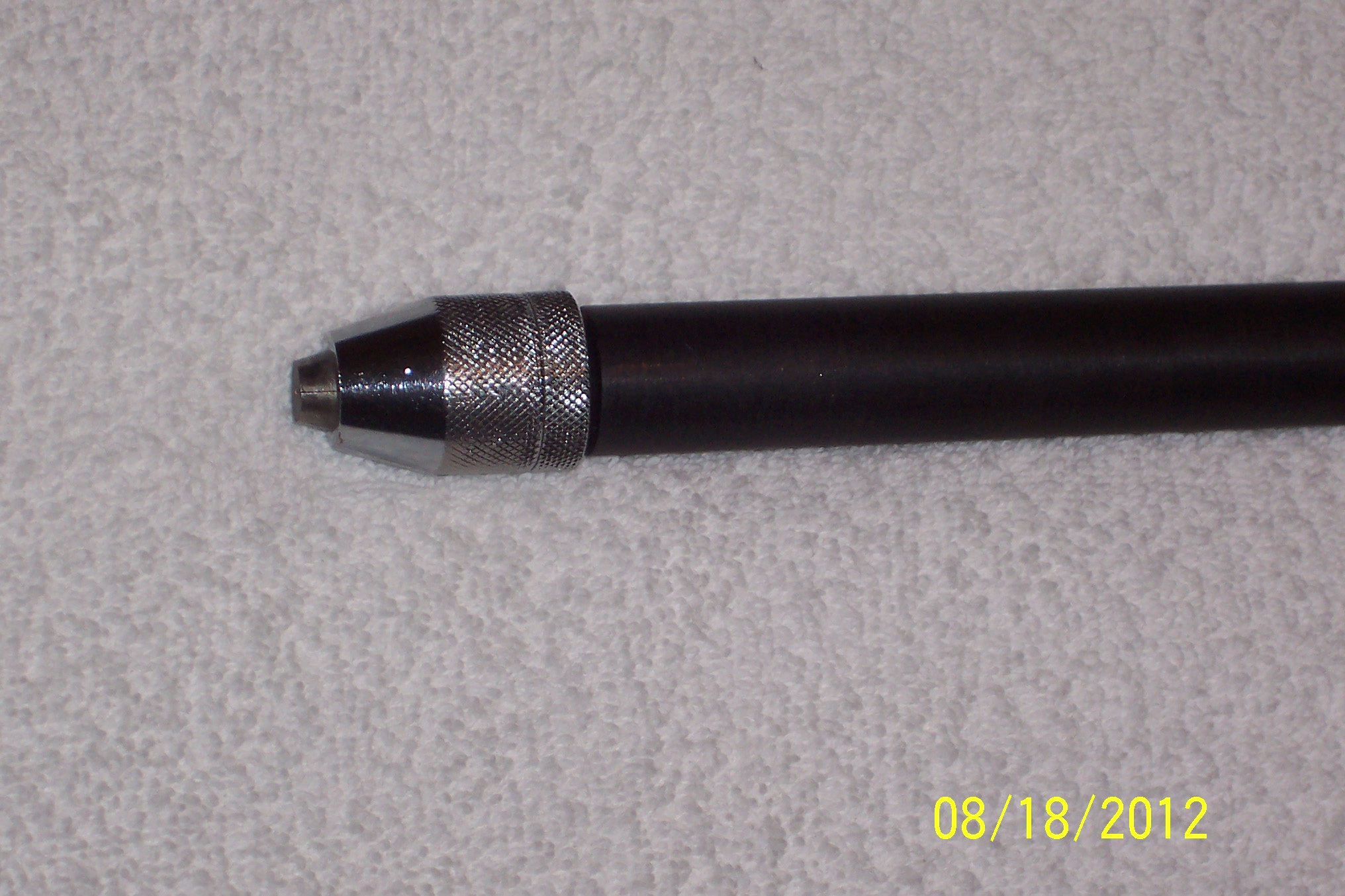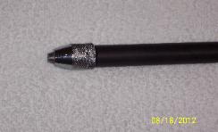 | This tool will make every other Ishi stick and hand held flaker/notcher obsolete. This is the culmination of nearly 3 years of research and development. It has all the benefits of a normal Ishi stick but has the totally new traits of being a takedown design. It easily breaks down into 3 pieces in a few seconds for ease of transport and compactness. It still retains the same exact amount of flex as a normal one piece Ishi stick. It is a full 7/8" in diameter, constructed of the finest materials, and machined to the tightest tolerances. Either end is a tool in it's own right. One has a standard 3/16" copper nail and the other end has a specially designed chuck that will hold any size nail or other device from 0" through 1/4". This chuck is hardened to hold up indefinitely, needs no tools to change inserts, and is in itself a marvel. All in all, this is the most innovative tool ever designed for flintknappers. It took nearly a year alone to design the chuck. This tool is not cheap but for all involved is priced more than fairly, especially considering it's extreme versatility. I guarantee you won't find these tools ANYWHERE else. Click on the thumbnails below for full size pictures!!! |